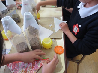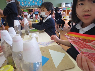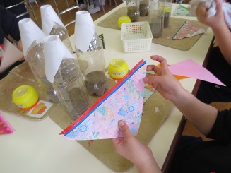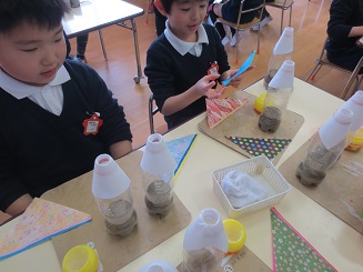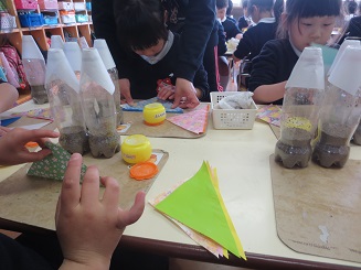 子どもたちは、ペットボトルに砂を入れたり、きれいな色紙にのり付けしたり、