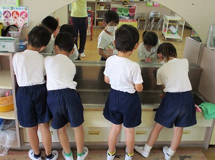 「まん延防止等重点措置」の延長を受け、例年実施しております保育参観の持ち方の変更にご理解いただき感謝いたします。22日に分散型保育参観の計画表を配布しました。第一希望を優先に計画表を作成しましたが、思い通りにならなかった保護者の皆様のご理解に感謝いたします。参加人数を踏まえ三密を考え計画表を作成したことにご理解下さい。参加に際しましては、配布しました健康確認票の提出をお願いいたします。