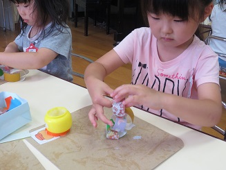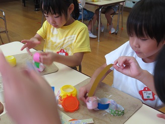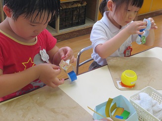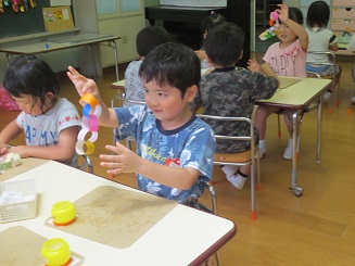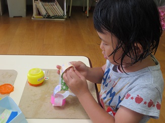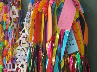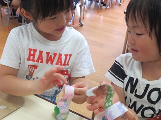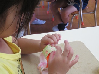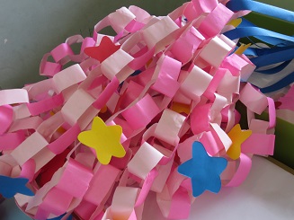 糊をつけるのにも丁寧に、輪に通してつけます。どんどんどんどんつなげて綺麗になっていきます。色や模様にも自分の思いが入っています。「さくら組だから桜の模様」と、選んだ色、みんながコツコツと作った色々な飾りを作りましたね。本日、