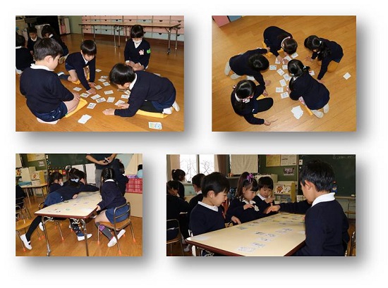 今日の子どもたちはカルタの絵札とにらめっこです。お正月に家で楽しんだカルタを幼稚園でも始めました。まずは数人のグループでカルタ取り遊びをしました。成績には個人差があるようです(>_<)でもみんな元気に楽しみました!これからみんなが上手になります。