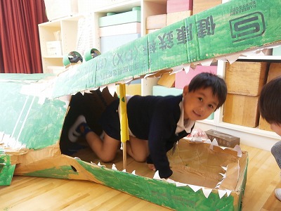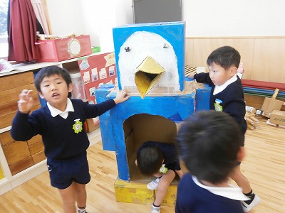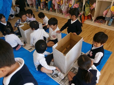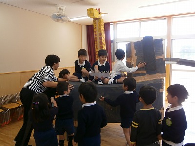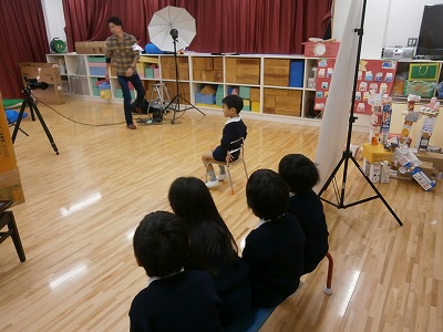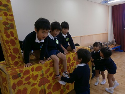 さくら組は、朝から、アルバム用の写真撮影をしました。かわいい髪型にしてきたお洒落さんもいました。緊張で顔が固くなってしまった子もいましたが、良い顔で撮影してもらいました。その後、リズム室で、動物園ごっこをしました。エサをあげたり、乗ったり、回ったり楽しく遊びました。ゾウやキリンが、動く姿は、迫力がありました。今度はうさぎ組を招待して一緒に遊びたいと思っています。