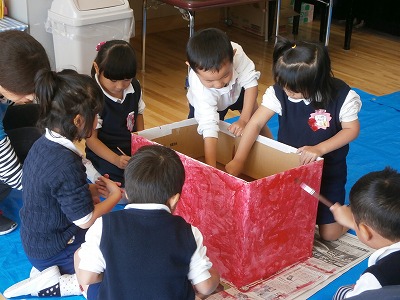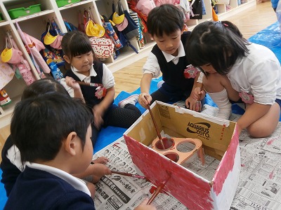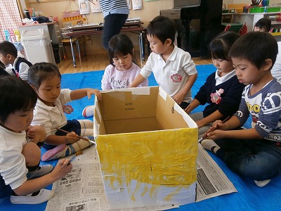 うさぎ組は、電車に色を塗りました。いろんな色の電車が完成しました。久しぶりに絵の具を使い、楽しく色塗りができました。