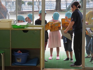 今度は、勉強として、目標をもって、幼稚園てどんなところか調べん来たのです。「かっこいいー」