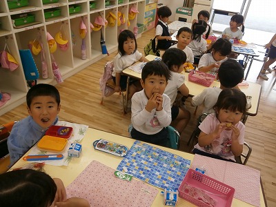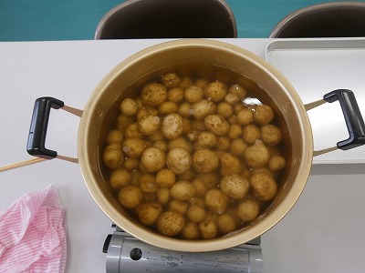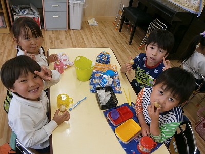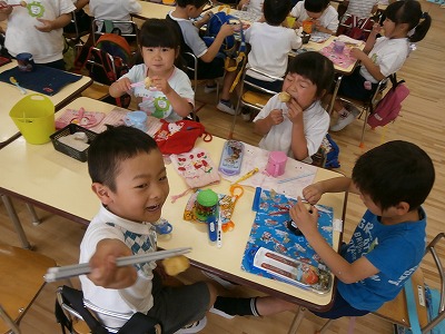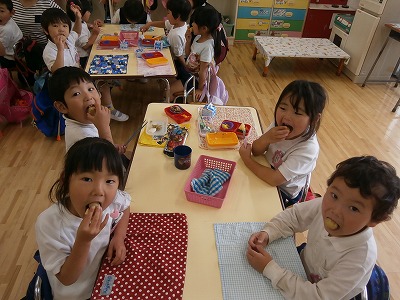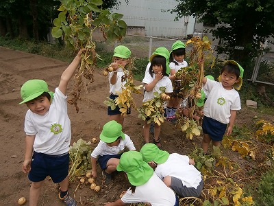 ジャガイモほりをしました。茎を引っ張り上げると、「大きいのがとれた~」の大声援でした。また、土の中から、ほり上げていくと、「まだあった」「また出てきた」と、大喜びでした。幼稚園では、塩茹でにしておいしくいただきました。おうちに持って帰ったジャガイモ、おいしく召し上がってください。