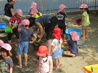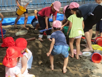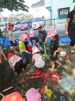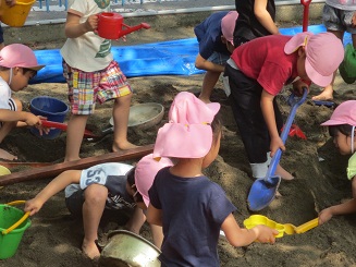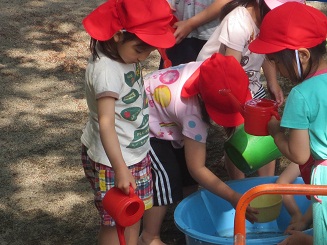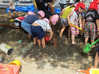さくら組さんは足に伝わる水と泥の感触は久しぶり、きりん組さんは初めてなので、驚いたり、遊び方に戸惑ったり、でも、年長さんの動きを見ながら、自分のできそうな遊びに・・・。きっとだんだん慣れてくることでしょう。次の時は何しようかなぁ・・・。泥泥の感触はなかなか大人では遊べないからね。よごしもいいから楽しんでくださいね。お母さん、お洗濯よろしくお願いします。