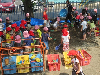 水も冷たくなく川をつくつて水を流したり、足湯にしたり、スープをつくったり、そうめん流しのマネしたり それぞれの発想で砂と水に親しみました。