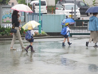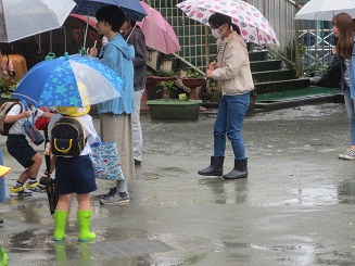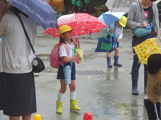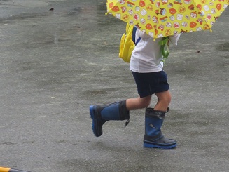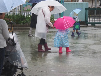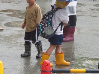 雨の音、園庭の水の流れに不思議がったり、傘を差しながら「ピシャピシャ」と水たまりを踏む、跳ね上がる水しぶき、こんな当たり前な雨に楽しみの反応が・・・。また、お母さんと一緒に傘をさすのも、長靴を履くのも楽しみのようです。