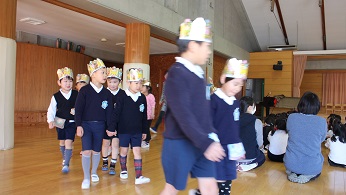 初夏のような日差し、一気に桜が開いてしまいそうな暖かい日となりました。今日は、3月の誕生日会。3月だけは幼稚園に合わせて、早く実施し、給食メニューもお祝いメニューです。修了証書の授与間近となり、みらい幼児園おかべとおかべ幼稚園の5歳児が交互に練習をしている時期なので、練習の合間を見計らっての実施となりました。将来の夢を聞かれた幼稚園の5歳児は、漁師さん、野球選手、電車の運転士さん、ケーキ屋さん、3・4歳児はそれぞれに好きな食べ物の質問を受けていました。りんご、いちごなどの果物やポテトフライなど、めいめい元気に答えることができました。もうすぐ、一つずつ進級するにふさわしいしっかりとした答えでした。4月生まれとはほぼ1年間という時を若く生まれた3月生まれ、みんなと同じにやってることの立派さを痛感します。誕生会、おめでとう!