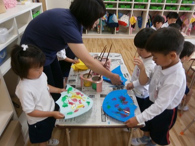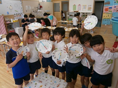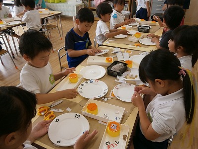 うさぎ組は、傘に写し絵で模様をつけていました。さくら組はカレンダーの数字を切り、紙皿に張り付け、時計作りをしました。