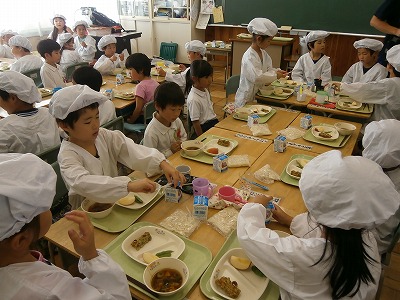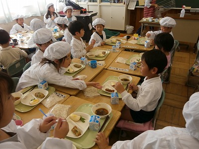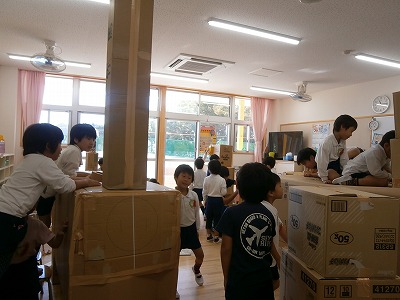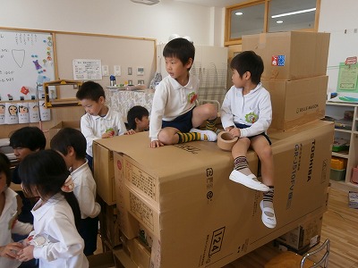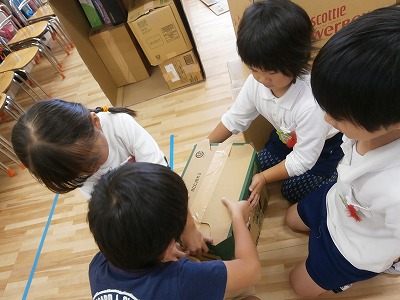 さくら組は、動物づくりをしました。「乗れるようにするには、どうしたらよいか。」や「はがれにくいガムテープの張り方は、どうすればよいか。」などを考え、チームで協力して作りました。また、午後は常盤小学校の1年生と一緒に、給食交流をしました。とても貴重な経験ができ、「給食美味しかったね。」と笑顔で帰ってくることができました。