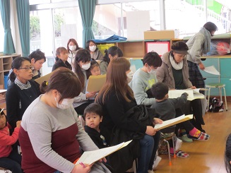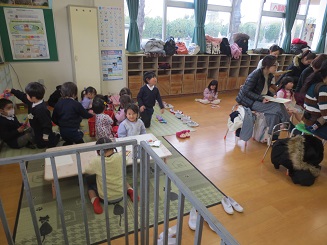 来年度入園するみなさん、元気ですか、今日も寒いですか、庭には桜のつぼみが膨らみながら、今か今かとみなさんの入園を心待ちしていますよ。4月になったら桜の下で楽しく遊びましょうね。