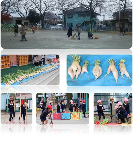 子どもたちは生活発表会に向けて今日も頑張っています。また、園医の金井先生のご好意で今年も大根を収穫させていただきました。いっぱい収穫できたので子どもたちは家に持ち帰っていただきます。大根の中にはかわいらしい形をした物もあり、子どもたちはびっくりしていたようです。※写真は収穫した大根と今日の様子です