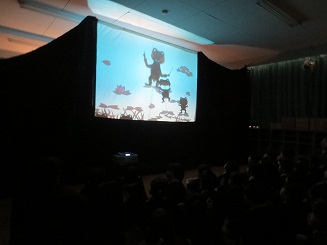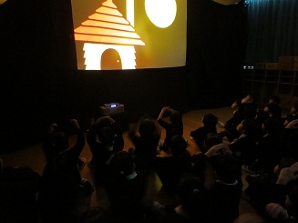 その中の動物影絵は、影絵で大きさが自由自在になるので、急に大きくなったり小さくなったりと動かし、園児たちは、大はしゃぎです。暗い中での雰囲気と集中が驚きを一層引き立てていたようですね。