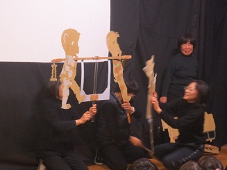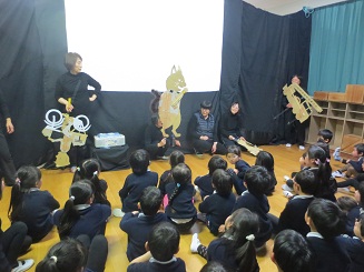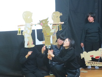 最後に、影絵の幕裏の人形の動かし方を見せてくださり、紙で作った動きの仕組みアイディア等を教えてくださりみんな感心していました。