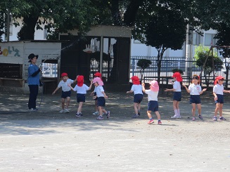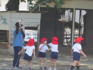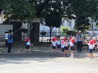 桜の下の木陰で外遊びをしました。ベランダで気温31度 湿度61パーセント暑いですが、帽子をかぶり15分程度の外遊びタイム実施です。健康観察し体調の悪い子はいません。しかし、寝不足・朝をしっかり食べられない子は、一気にこの暑さに熱中症の危険もあるので注意しながら、外遊びです。