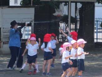ホースのシャワーが気持ちよく、かけられるの楽しくみんなが集まっていました。暑いだけに・・・、みんながいるとそれだけでも楽しい時間です。