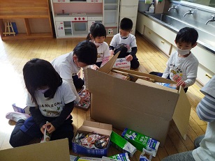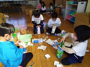 子供同士で話し合い、はさみで切る係とガムテープで貼る係に分かれたり、