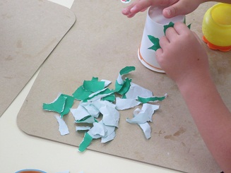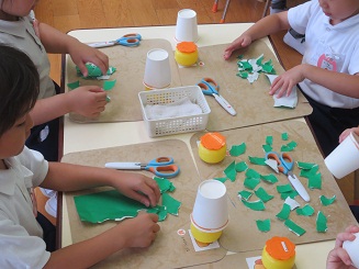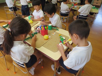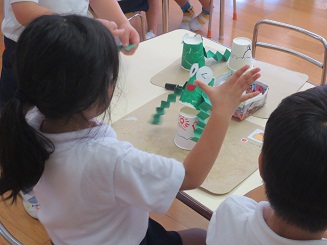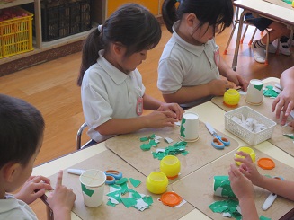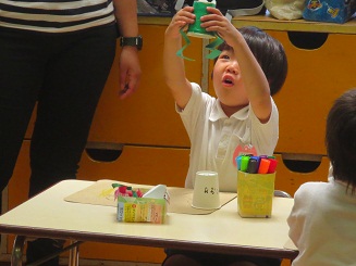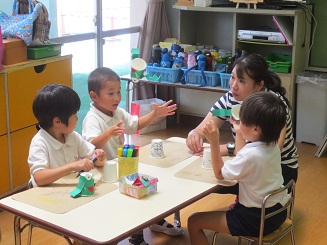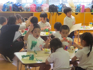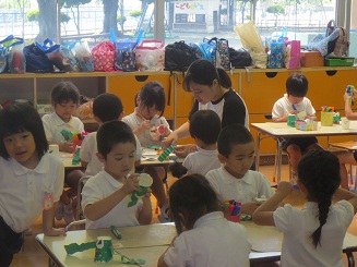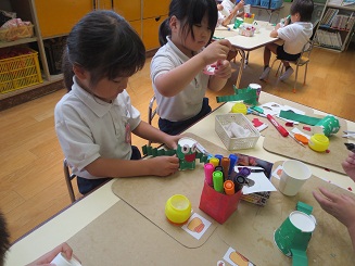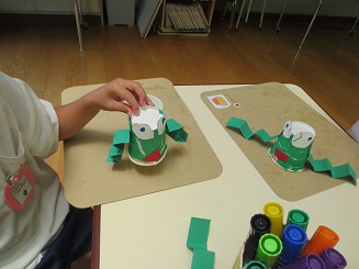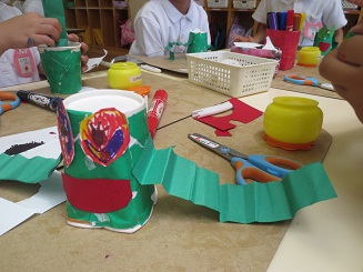 楽しみました。 園児に製作の達成感を楽しさを味あわせるために 生活感と思考の流れを意識させ、いざ製作へと進みました。色紙をちぎりカエルの色を紙コップに貼り付けます。糊を付けるのも難しくはないですが゛、どのようなカエルにしたいかそれぞれ考えています。目標を持たせるこことは製作の自分の意気込みを楽しくしますし工夫の基になります。何でもかんでも作ればいいのではなく、自分のカエルロケットです。腕を作り、のり付けして、最後に跳ばすと。ぴょーんビックリしたぁ! みんな驚き、たのしいです。先生もこの驚き・・・。私も楽しそうと声を出してしまいました。 昼休みも、家に帰ってもやりたいと感想を話していました。おもちゃづくり 製作活動は動くのがとってもたのしく夢がありました。