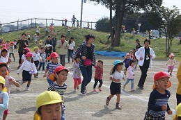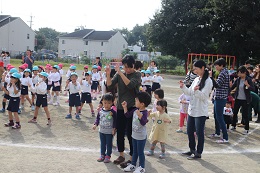 10月14日(金)は第2回子育てひろばが行われました。未就園児の園児と保護者の方が参加してくださいます。今日は、外遊び、そして保育園といっしょの「体操マラソン」も参加していただきました。8日(土)の楽しかった運動会を紅白玉入れ、そして障害走などいっしょに行いました。みんな元気いっぱいです。最後にしか組さんが運動会で披露した「よさこいソーラン節」を演技しました。吉井先生のミニミニ講座は保護者の方を対象に行われ、子どもたちはりすやしかのお部屋に入って一緒にお絵かきやままごとを楽しんでいました。小さな子といっしょになると、みんなお兄さんお姉さんになるのが不思議です。楽しく過ごすことができました。