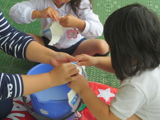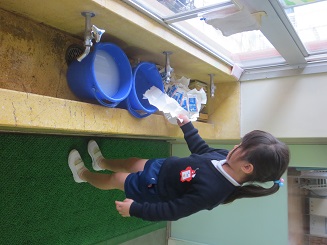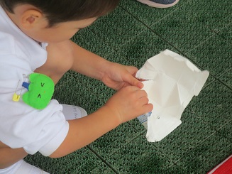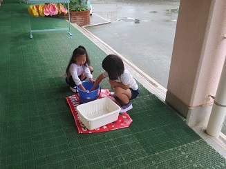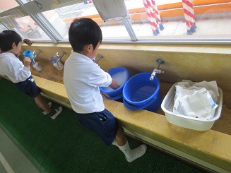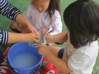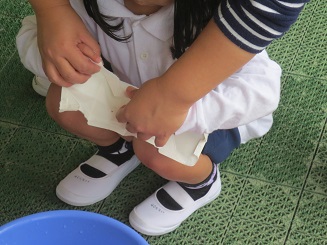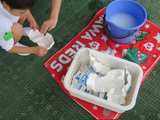 バケツに入った水で、水洗いはなんとかできますが、洗った後にパックを開くのに力とコツがまだまだ足りません。(さくら組さんになると一人ですいすいできるようになります。)