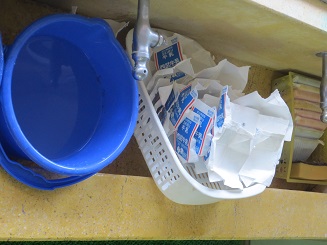 牛乳パックを再利用するために、幼稚園では飲んだ牛乳を資源回収に出します。飲んだ牛乳パックは開いて洗い乾かします。一日たって袋に回収します。きりん組さんは、2学期からその練習に入りました。ば