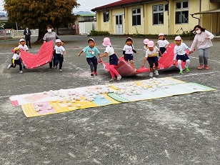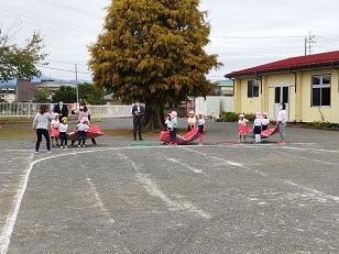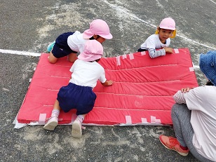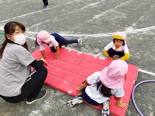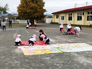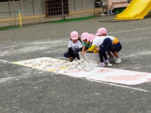 運動会で使ったマットで玉入れの玉を運ぶ競争をしました。