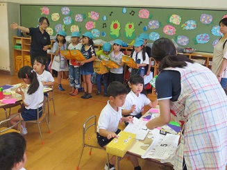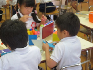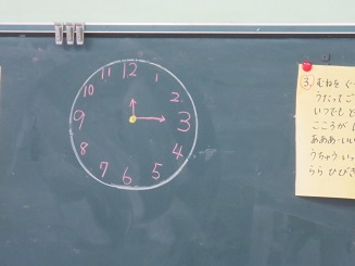 幼稚園では、時計の勉強はしていませんが、日常生活では結構時計を見て、長い針がいくつのところまで来たら・・・など使っています。チャイムがないので行動の始めや終わりを表すのに必要です。だから、普段から使っている時計です。