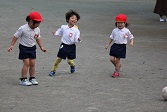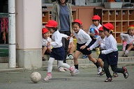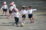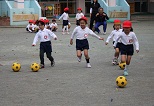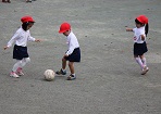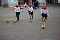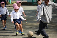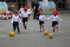 はしゃぎながら きりん組さんが、ボール蹴り遊びに挑戦