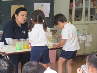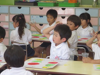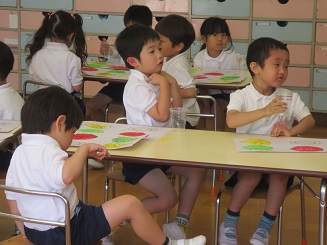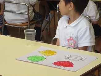 不思議ですね。食べたい飴の色に変身するのがたのしそうでした。絵の具の混色、興味深そうに、塗るのを楽しみに待ちながら・・・、園児の思いは広がる。学びのワクワク。