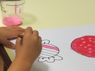 きりん組さんは、くだものの色塗り、黄・黄緑・赤の鮮やかな色絵の具を使って、いちご・メロン・バナナを美味しそうに塗っていました。