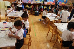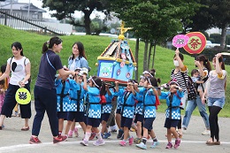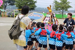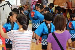 7月8日(金)は、おかべ幼稚園の夏祭りです。登園後、保護者の方に祭りの衣装を着つけていただき、ほどよい天気のもとで第1部を開始しました。PTA会長さんのごあいさつに続いて、体操でウォーミングアップしたあと、1クラス2チームに分かれてお神輿を担ぎました。最後は保護者の方々といっしょの踊りを楽しみました。