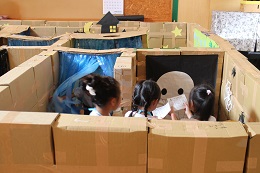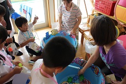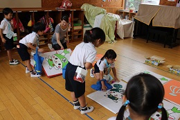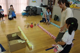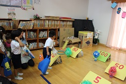 休憩のあとの第2部は屋内です。保護者の方々が何日もかけて作成してくださった手作り巨大迷路、つりゲーム、ペットボトルバックに絵を描くクラフト、輪投げやボーリング、宝さがし、ふっかちゃんの絵合わせを楽しむ神経衰弱と、全員がすべてのゲームにチャレンジし、楽しみました。