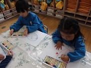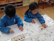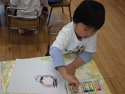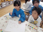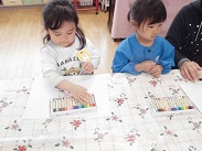 4・17(火)、クレヨンの使い方の約束を聞いて、今日初めてクレヨンを使ってお絵かきをしました。一人一人、好きなように絵?を描きました。すてきな絵もたくさんありました。