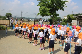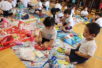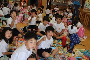 6月3日(月)は、お空の神様のおかげで、きれいに晴れました。4・5歳児は魚取りのあみをもって、近所の用水路へ行きました。メダカやヤゴ、たにしなど、バケツにいれて幼稚園にもどってきました。そのあとは、公民館の方のご厚意で、ホールをお借りしました。みんなで、音楽に合わせて、体操を楽しんだり、クラスごとにみんなで遊びました。幼稚園に帰ってから、みんなの大好きな手作りお弁当をお部屋でいただきました。3歳児は、初めてのお弁当です。きっと大好きなものをいっぱい詰めてくださったのでしょうか。うれしそうに食べていました。