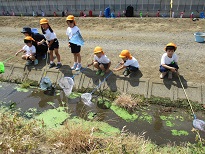 これから、水槽に入ったエビやメダカをお世話します。「何を食べるのかなぁ」「どんなお家が気持ちいいのかな」、図鑑を見たり、先生と相談したり、「学びの根っこ」が広がります。
