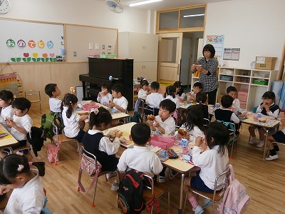 うさぎ組さん初めての給食です。初めてのことで、戸惑っている様子も見られましたが、みんなで楽しく食べる姿が見られ、安心しました。