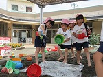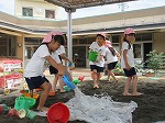 今日は砂場にシートを敷いて水たまりをつくって遊びます