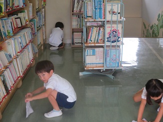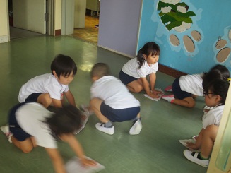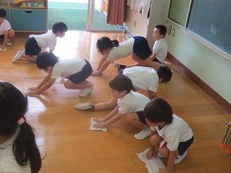 その前に、園児たちも水拭きで磨きました。