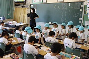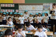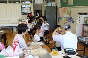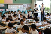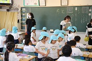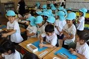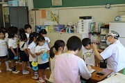 ばら組の園児が花園小学校の保健室で耳鼻科健診を受けてきました。みんな、きちんと並んで健診を受けることができました。健診後、1年生の教室に入り、授業を見学させていただきました。昨年度のばら組のみんなが笑顔で迎えてくれました。園児たちは、1年生の授業風景を見て、少し緊張ぎみでした。