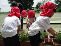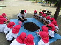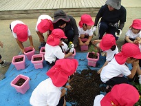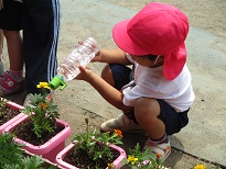 5月29日(火)は、朝からよい天気です。体操マラソンを終えて、一休みしたあと、3歳児クラスが一人一鉢を準備しました。しか組さんときりん組さんは昨日、行いましたので、今日から水やりを開始しました。ふかふかの土にさわって、担任の先生から、「やさしくおふとんをかけてあげようね」と言われて、大事そうに鉢に土を入れていました。準備ができたら、早速初めての水やり体験です。「元気に育ってね」、やさしいことばも聞かれました。