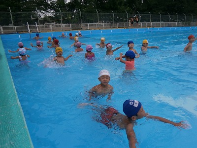 さくら組は、6年生と一緒に2回目のプールを楽しみました。6年生が、泳ぎ方を教えてくれたおかげで、前回よりも子供たちの体が浮くようになってきました。最後は「もっとやりたかった」と、残念そうにする姿も見られました。