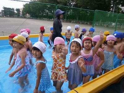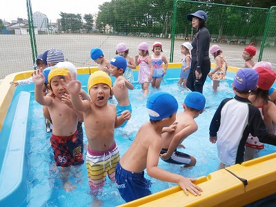 うさぎ組もプール遊びです。水鉄砲で水を掛け合ったり、楽しんでいる声が、園庭いっぱいに、響いていました。