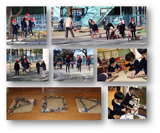 今日は寒さも一段と厳しく冬日となりました。でも、子どもたちは元気よく園庭で遊んだり、製作に励みました。園庭では身の丈六尺以上の「かわいい巨人」がかっ歩していました。年長児はみんな竹馬乗りが上達してきました!