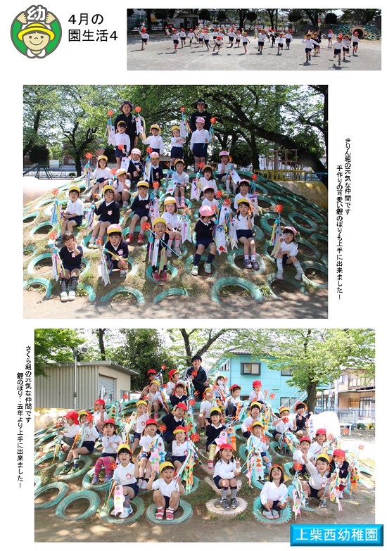 子どもたちは楽しい夏休みを過ごしています。この期間を利用して、一学期の活動を写真にまとめま紹介しています。今日はその4回目です。(鯉のぼり遊び)
