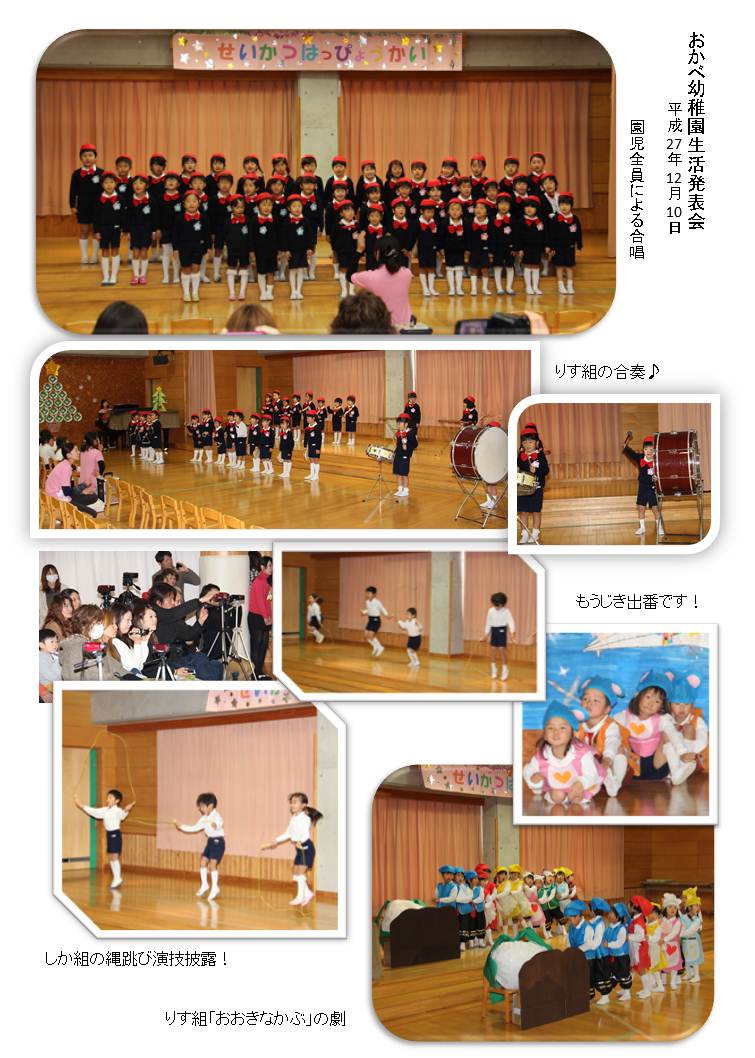 只今おかべ幼稚園の2学期の園活動のまとめを紹介しています。このことで、平成27年度おかべ幼稚園の教育活動をご理解いただければ幸いです。今日はその14回目(生活発表会その1)です。