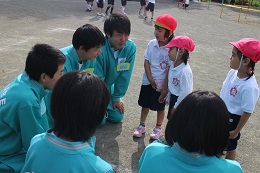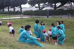 10月12日(水)は2回目の岡部中学校3年生の保育体験でした。先週7日に第1回目があり、しか組さんをうらやましそうに見ていたりす組さん、楽しそうにお兄さんやお姉さんといっしょに遊んでいました。「だるまさんがころんだ」やかくれんぼ、虫捕りなどやさしく接してくれる中学生に楽しそうな笑顔を見せていました。運動会が終わり、今日から再スタートした体操マラソンにも参加していただきました。