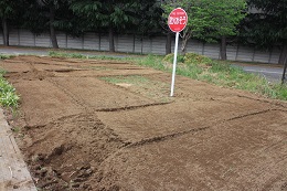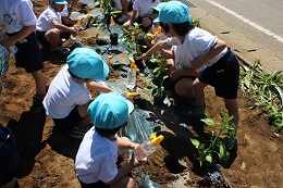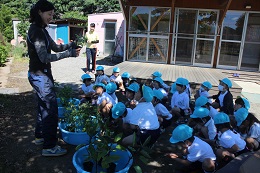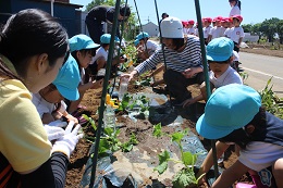 5月12日(木)の午前中に野菜の苗を畑に植えました。4月、そして前日とそれぞれ畑を機械で耕してくださった方々に感謝しています。あっという間に畑の土がふわふわになりました。そして、畝づくり、これもお向かいの畑の小林さんに教えていただきました。そのおかげで前日の雨もあがった12日に苗植えができました。しか組のお兄さんやお姉さんが植えてくれるのをりす組さんがそばで応援しました。保育園の園長先生も手伝ってくださり、みんなで初夏の日差しの下の作業でした。トマト・なす・きゅうり・ピーマン・すいかの5種類を植えました。これから、毎日、園児たちが水やりをしながら、「大きく育ってね」と呼びかけることでしょう。