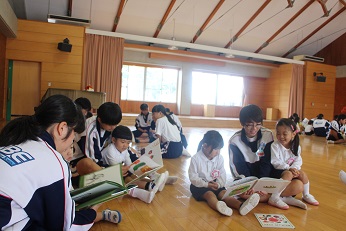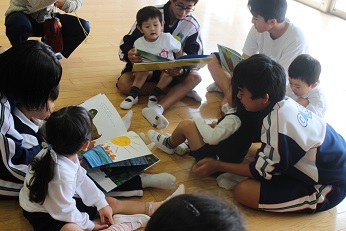 10月12日(金)、昨夜から雨が降り続き、天候を心配しましたが、お空の神様は見事に雨を止ませてくれました。担当の先生によると、クラスの生徒さん方は朝から、とても幼稚園訪問を楽しみにしていてくださったとか。やっぱり、その情熱が届いたのかな。外遊びができました。やさしく手を引いてもらって、声をかけてもらって、園児たちもとても楽しみにしている中学生の幼稚園訪問。やっぱり、読み聞かせには目を輝かせて近くへ寄り、練習の成果が発揮されたお話に興味津々の様子でした。ありがとうございます。