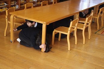 4月に年間計画に基づいた避難訓練を開始して、みんな「すばやく」そして「確実に机の脚をつかむ」などできるようになりました。どのクラスも先生から心構えや避難の仕方の注意を聞き、おしゃべりする声は保育園、幼稚園どこからもきこえないほど静かななかで行うことができました。自分の身は自分で守るためにはどうしたらいいのか、そして大勢がいる中では先生の指示を静かに聞く、これからも繰り返し、訓練を継続していきます。
