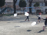 ビニル袋に絵を描いて、紐は短めにして走って袋に風を受けて飛ばしました。